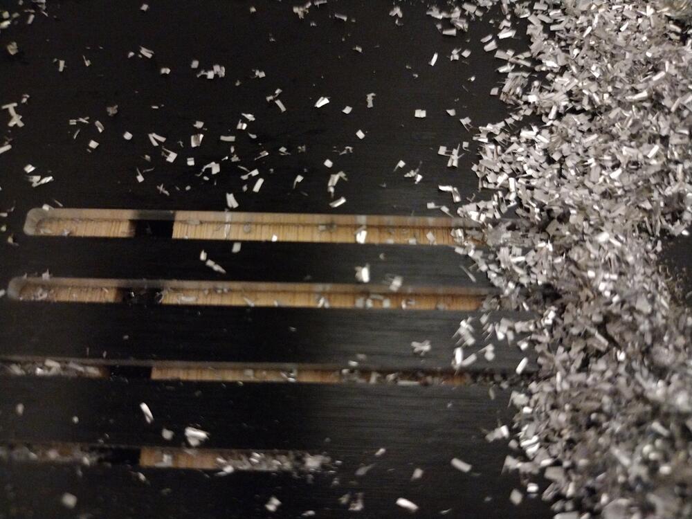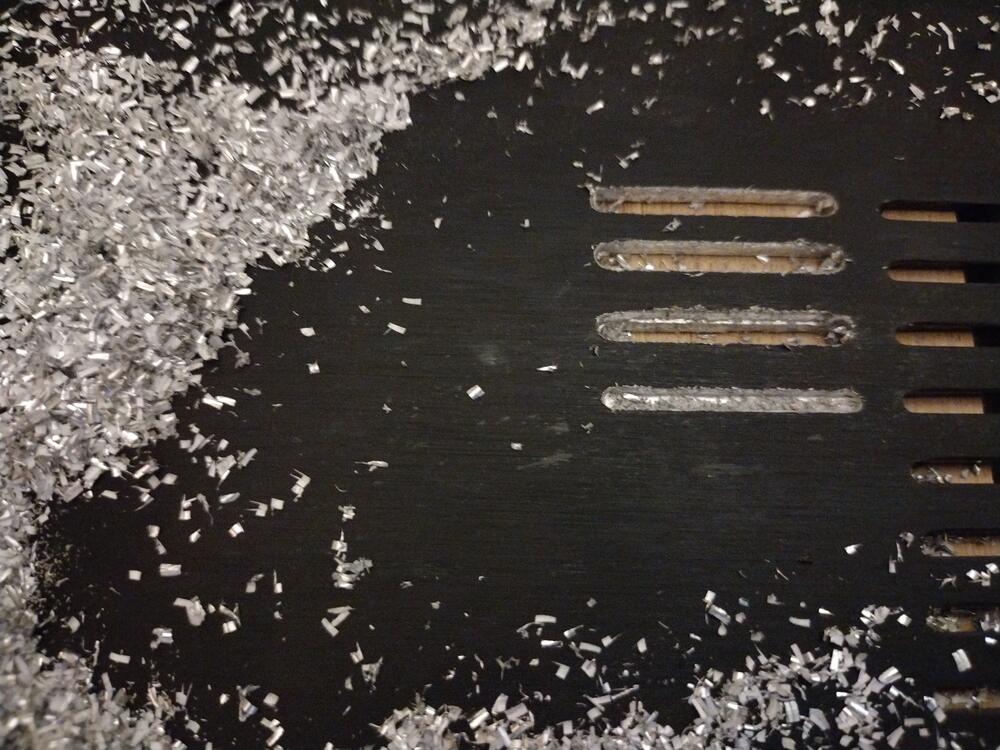 I'm starting to get the feeds and speeds dialled in now I have a 1.5Kw water-cooled spindle and some good spoil board bed rigidity, properly levelled and trammed the machine. I'm slowly gaining confidence and beginning to believe the reviews that said the Vasto can cut aluminium... I managed to cut ventilation slots in aluminium using a 2mm diameter single flute DLC end mill with 300mm/min feed rate, depth of cut 1.6mm, 50% overlap, 18000rpm. The test slots were 160mm long, 3mm deep, I tried 2mm, 3mm and 4mm widths.... surface finish is like a mirror, no burs and no chips welding themselves to anything. No cutting fluid was used and there was no finishing pass: Thats so better than my first attempts with the 400W motor and a corn cob end mill which produced garbage surface finish at much lower surface speeds, much lower depth of cut and destroyed the end mill very quickly: -