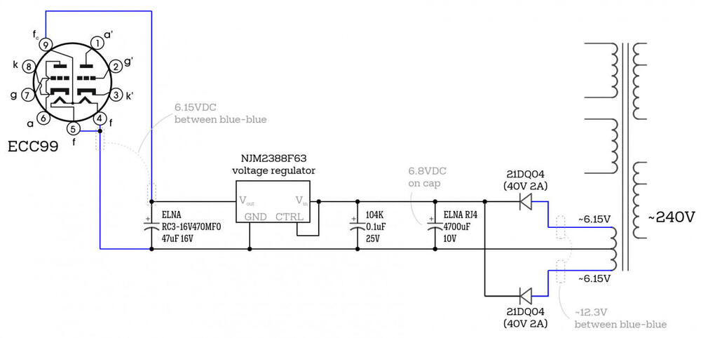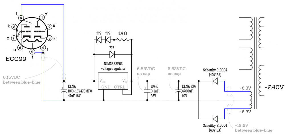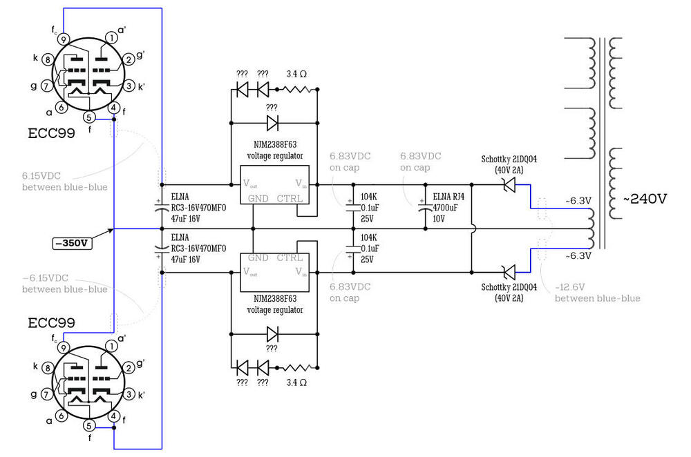I've measured all voltages: - measured blue to blue = 12.3VAC - measured on the capacitor 4700uF/10V = 6.8VDC - measured at the tube filaments after the regulators = 6.15VDC - measured everything referenced to black -347V Two diodes is 8B 21DQ04. I dropped them off and checked them out. They are guaranteed to work (they pass in one direction and infinity in the other). Circuit: All that remains is to return the old capacitor and see if it will warm up. If so, that's his normal state.