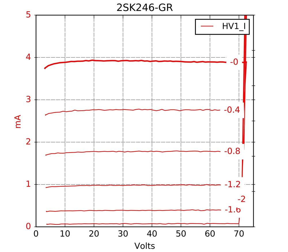 I can't find what current measures DY294 in the breakdown test ( In the datasheet for 2SK246 Vgds is 50V and in my measurements I have 69-73 Volts. Maybe DY294 just can't detect 0.1 mA ( Unfortunately I can't limit current to 100uA in my etracer, but I will think what can I do. I hope the measurements will not damage the FET, because it measures using pulses with duration up to 5-10 ms. But I know it is still not safe. Thanks.