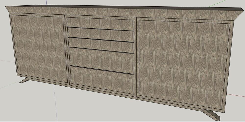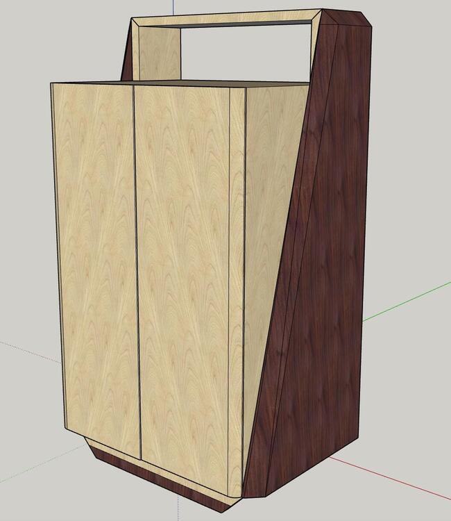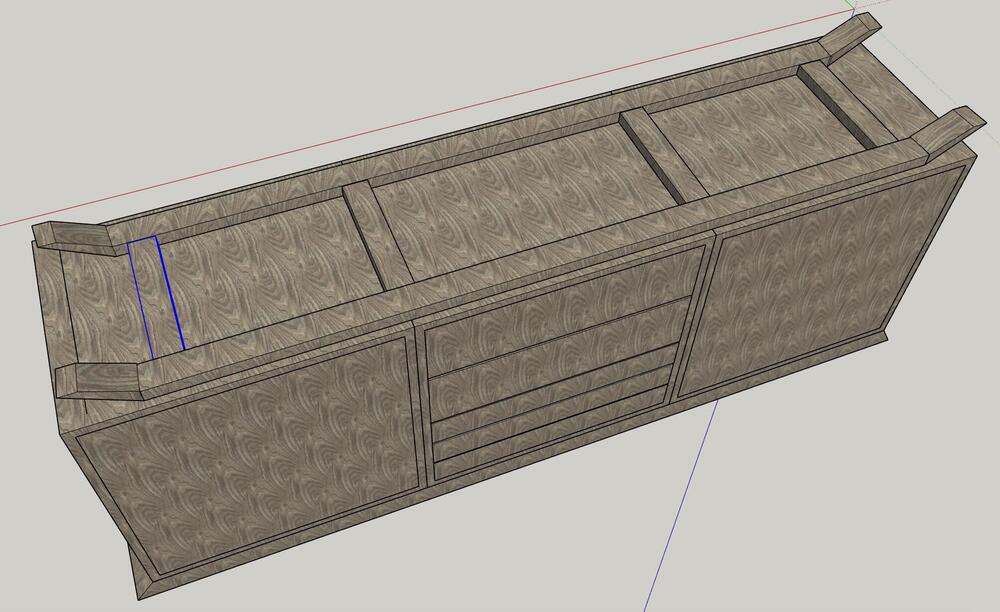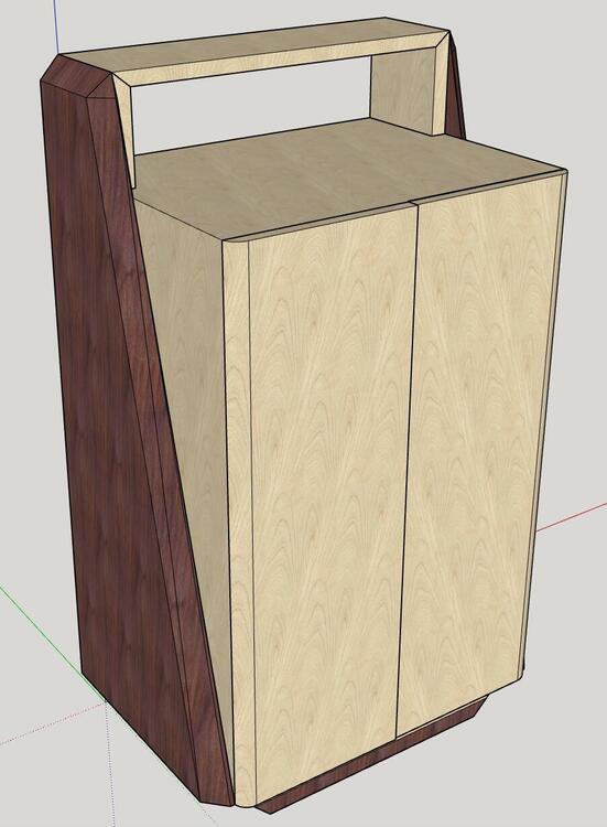 While the shop is shut down until the electrician decides it is warm enough to run the conduit outside, I have been trying to learn Sketchup and model some of the projects I am in the middle of. Kind of clunky at first but it works pretty well you you figure out all the tools. Need to download some more wood textures as I do not like the Walnut I have and there is no Ambrosia Maple, the lighter wood in this project.