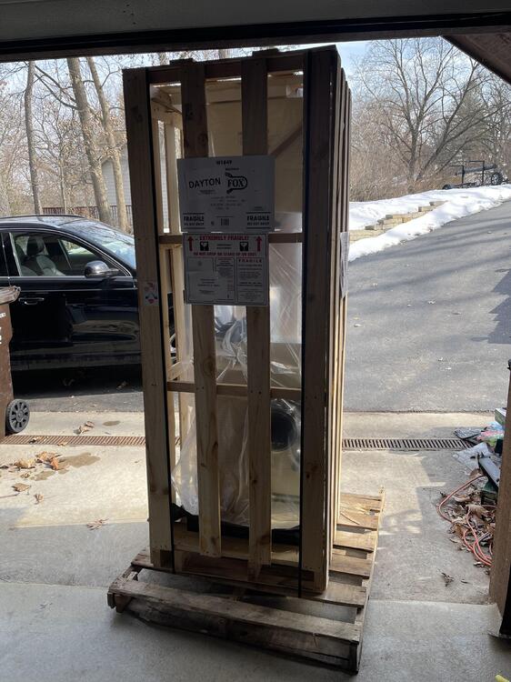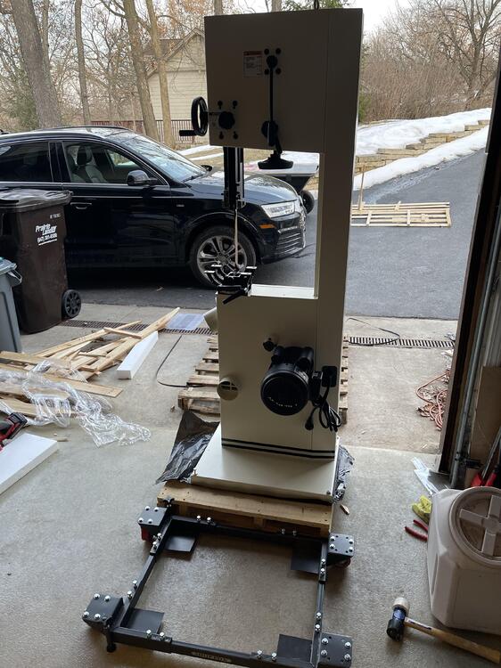 Managed to manhandle the shop fox off of the two pallets and onto the massively shitty shopfox stand they recommended. Going to have to order something better for the rolling cart but the saw seems okay for the low price.