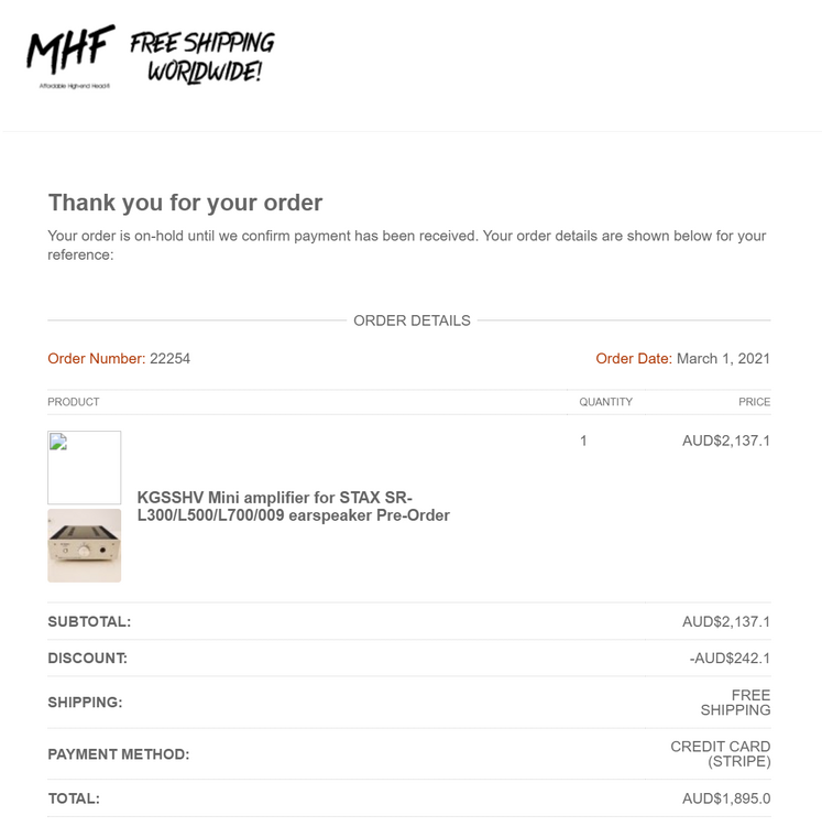 I'm the owner of the KGSSHV Mini in question. The origin of the unit is the AU store MyHeadFi. It is quite the story for me, so I'll post the events of what happened incrementally if I get the time. I posted the e-receipt of the order that was placed. Long story short, I owned the unit for less than 3 weeks before it died completely on me. The seller absolutely 100% refused to issued a refund (Vance from MyheadFi) and I had no choice but to ask visa to file a dispute for the lost funds in questions. He was unhelpful and demeaning all around (more on that to come). I eventually won the case, but at the cost of considerable time, money, and sanity. Visa's requirement to file a claim was such that a 3rd party must analyze the ordered product and determine whether it was in proper working condition. The second requirement was that this 3rd party had to be a qualified vendor with an online store that sold a similar product. The problem with these 2 requirements was that, as far as I'm aware, Mjolnir Audio is literally the ONLY 3rd party on the face of this planet that was qualified to provide a statement to Visa because he is the only vendor of these amps with an online store and the only vendor of these amps that designed them. Spritzer and Kevin Gilmore worked in conjunction to design these amps, and, as such, every other 3rd party or diy builder either wouldn't have a registered store of their own or wouldn't be qualified to assess a defective unit. Spritzer was kind enough to do me a favor and provide evidence to visa that the amplifier in question was in fact 100% defective and in non working order. I have to pay over 200$ to have the amplifier rushed out to Spritzer and analyzed within the timeframe visa had requested, which is quite the hefty shipping fee. Now lets fast forward to just about 24 hours after I received notification from visa that I had won the dispute with the seller and things start to get even more interesting. I did get all of the funds back from visa after they issued a chargeback for the full amount. However, I started to receive threatening emails from the seller. I also I opened up my visa statement to find some fun surprises. Low and behold, I saw the thing I suspected I would see: Even more fraudulent charges on my account! Why did I suspect this? Well, because the seller still had all of my credit card information and boy was he still pissed at me. So in total he managed to rack up about $2000 to $3000 worth of Sony Entertainment charges, which I can only assume are related to Playstation digital goods, as well as a couple of food delivery charges for a company that doesn't exist where I live. Let me be clear in stating that I do not own a Sony Playstation, but instead own a high end PC with a brand new 3090, so it stands to reason I would never stoop that low ; ) Anyway, as I write this now I am STILL in the process of disputing all of these fresh fraudulent charges on my visa statement. I was assured by visa that all of this will go away soon enough, but it's still a huge pain to deal with. Ironically I also read what happens to online game accounts like PS4 and PS5 accounts that are flag for fraud or initiate chargebacks. Essentially their accounts get blocked until they end up covering the lost funds, so these accounts become unusable. If they spent considerable money on these accounts prior to the fraud, their library of digital goods is basically forfeit and they shoot themselves in the foot. So if you're reading this, have fun with that, I guess? Moral of the story? Don't buy knockoff goods from crooks and scammers. Buy only from legit places or sellers you already know. Steer clear from MyHeadFi. Jr. Audio products are total utter trash. My unit failed in various ways over the course of a few days during light usage. If you want to risk it after reading this, you deserve what happens next. Remember that you get what you pay for.