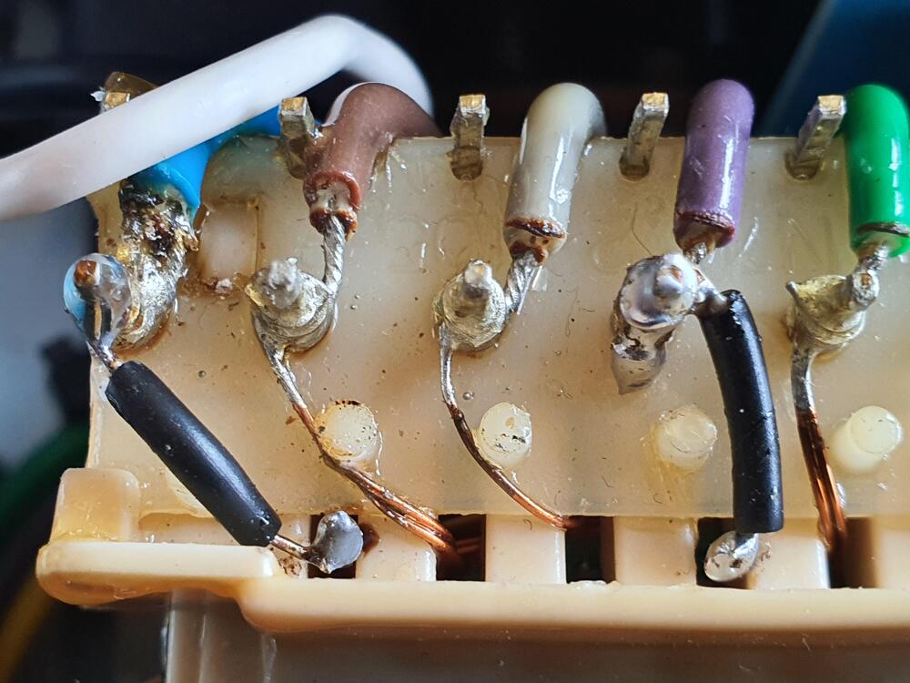 It seems like there's just enough copper to solder some jumpers in order to connect the blue and purple wires to the transformer, so I'll do that first. Next is the voltage selection change. Here are the questions: