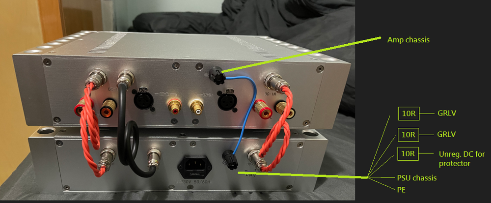 and now for something completely different part 3EL_Ken replied to kevin gilmore's topic in Do It Yourself Had done isolations between sands and heatsinks. And then finish casing the PSUs (PE connected to case). When I powerup GRLV alone, DC voltage goes wrong and pass transistors dead. After checkings, I find GND on one of the GRLV shorted to case. Top green insulation layer of pcb (near mounting hole)is damaged. This short GND and case through screw. So I thought that's the reason the transistors dead. Maybe the transistors were damaged by desoldering, had to resolder them to fit the case. But none of the circuit connected to PE will cause risk of electric shock. And proper grounding can block out noise. And I found some of your words said before. Hope my drawing below is understandable. GND: Splitboards > 10R resistor > amp case > extra wiring to PSU case > PE