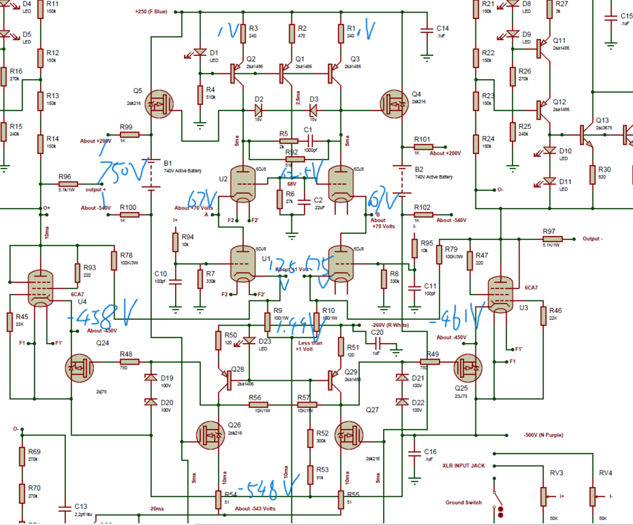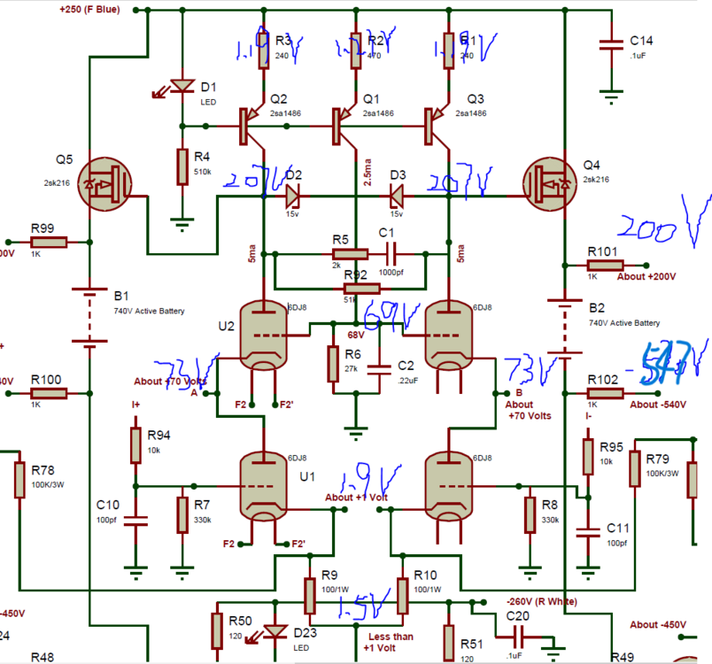 Definitely regret saying the famous last words, all LEDs replaced in left channel and I'm still getting -30V ~ -40V of offset at output, and balance servo is not kicking in neither as +/- output likes to stay a few volts apart. I measured as much node as I can think of, after setting battery to -547V/200V. EL34 plate load CCS measures fine, current going thru R17-R20 adds up to 10mA Output tube voltages measures ok on one side, the other side measures worse with -453V at cathode and -457V at the gate of the 2sj79. Current going through Q26 and Q52 seems fine. input stage CCS voltage I'm not sure if I'm measuring the 207V correctly with my handheld meter with 10Mohm impedance, if this is indeed 207V then Q4 and Q5 are seeing a Vgs of about 7V? And lastly the bottom part point C and D are both around -3.5V. I also tried to measure a 2sa1413 with very low collector current on a scratchy breadboard circuit, at Ic = ~46uA hfe is somewhere above 90, which should be fine. Other than that I have set the battery voltage to -547V/200V, leaving the trimmers alone and turn off the amp, turning on again when high voltage kicks in for an initial period battery voltage likes to be -500V/245V, then all of a sudden it becomes -547V/200V again and stayed... Also isn't the current going through Q30 and Q31 coming from the battery via Q23? In that case I'd expect a few volts drop across R99 and R100? Which when I measured there isn't any. Is there anything looks obviously suspicious from my measurements? Would really appreciate any input, thanks!