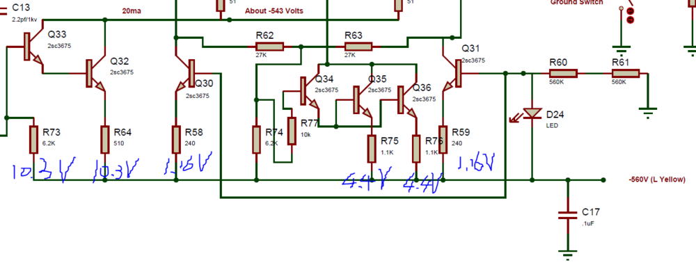 Thanks, that makes sense! Strangely when I diode test BE junction on Q32 and Q33, they measured fine. Hook them up to transistor tester on board they also got recognized as NPN fine with correct hfe. Power on and measure again voltage drop across R73 and R64 are still the same with V(R73) only maybe 20mV higher. But voltage drop across R64 seems correct on its own with about 20mA running through Q32 so both devices should be on... I also measured actual Vgs for Q4 and Q5 both below 1V so not gonna worry about them now. I been also thinking about the diodes, since previously all my LEDs are de-rated by quite a bit (likely thermally) and replacing them made things better. Are D2 and D3 for protection purpose only and not meant to be driven into reverse breakdown under normal circumstances? least measuring voltage across them are near zero, so derating should not matter here? Tomorrow I'm finally gonna replace the K246s, since there is still something finicky about setting voltage across R42..