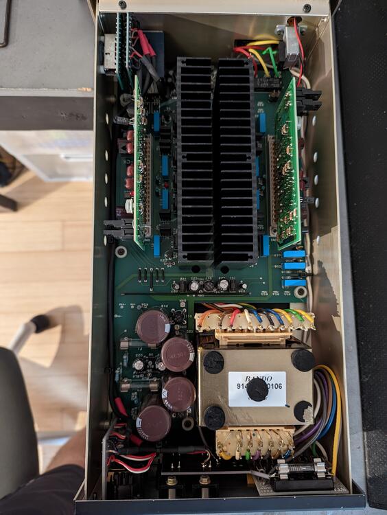 1. Hello Everyone, Stax noob here. I'm fairly new to electrostatics, but I did do my research before upgrading from my SRM-3. I managed to snag a 717 in what seems to be extremely good condition for around 670 USD a couple months ago. I've been really enjoying it, but I want to make sure the thing will last. I've read several times now that the electrolytic caps are a concern with aging Stax amps, and I want to know if they are any parts that need to be replaced in my unit in the near future. I'm also interested in making upgrades if possible and converting my unit from 100V input to 120V, but those are less of a concern. I cracked the amp open and pulled of the decorative PCB on the transformer to take a couple photos of its innards (attached below) in hopes that it may provide some indication of the level of work required to perform any of the tasks mentioned. I have some experience with soldering and some fairly basic knowledge of electrical circuits and the like, by my skills and knowledge are geared predominantly towards medicine and dentistry, so I would greatly appreciate any help or resources on how to perform the maintenance/mods, some direction as to where I can take the amp if i can't do it, and a rough estimate of the cost. Thanks in advance to whoever is willing to read this!