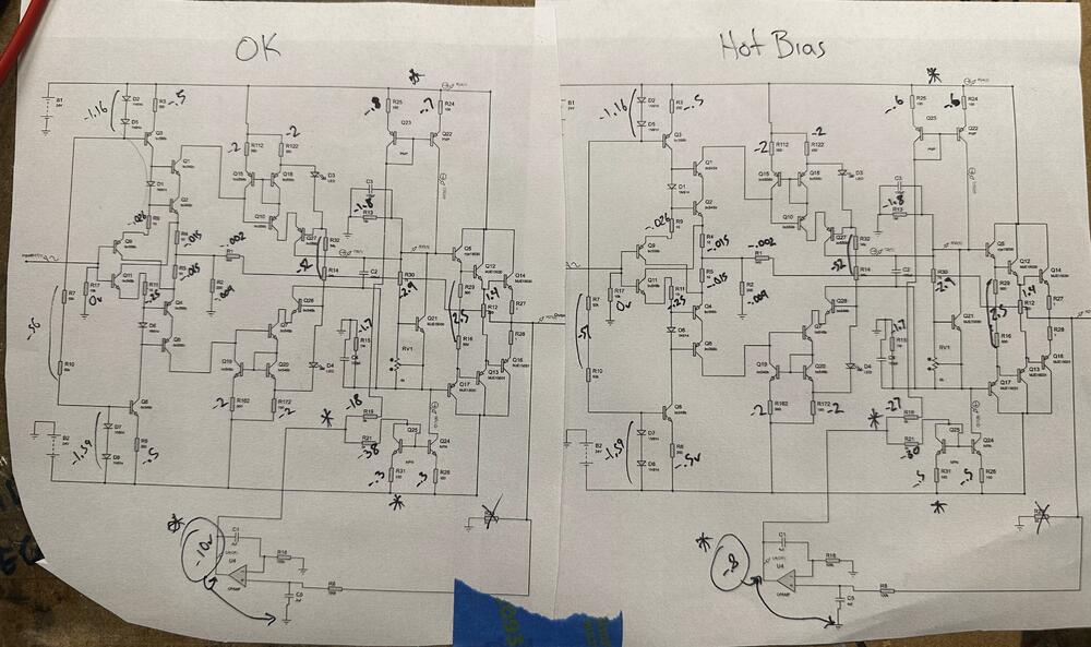 I bit the bullet and took measurements of an OK and the "Hot Bias" CFA2 boards. Here is what I found: Test conditions: OK board biased to around 120ma, trimpot in middle-ish position. Hot bias board has trimpot all the way down, which gives about 100ma of bias. Ran from the same GRLV at 30v. Clearly the big difference is the output of the servo is showing 10v on OK board, and only .8v on hot bias board. Servos getting proper voltage on each board. I swapped in a known good chip, no difference. The 5k feeders after servo are showing dif drops between boards too. Can anyone give me some guidance on where to go from here? -