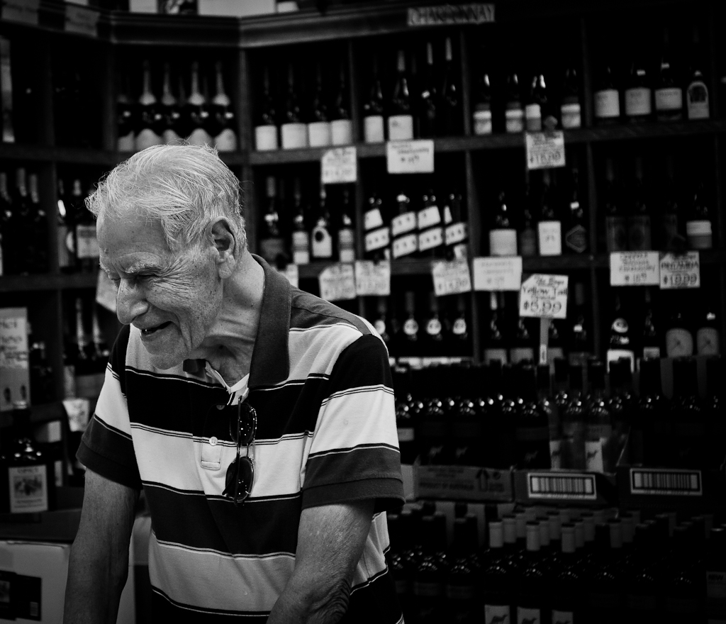 Was standing in line at an indoors farmers market. Lovely old couple ahead of me started talking with me. The gentleman had that old raspy double voice one gets when one has a bit of saliva in the throat. I wish I could have had a little more time to talk to him. Anyhow, his wife let out the loudest fart I had ever heard come out of a human body. EVERYONE started cracking up while the poor old lady turned beet red. Here is one I was able to take quickly. The guy was laughing so hard it looked like he was wincing in pain. I missed the moment but caught the tail end. Tried different crops but couldn't really do much with his wife's head popping up at the worst time. Suggestions welcome. -