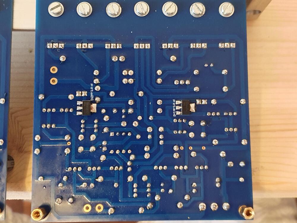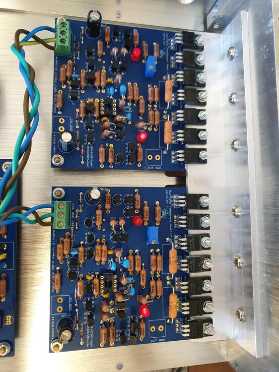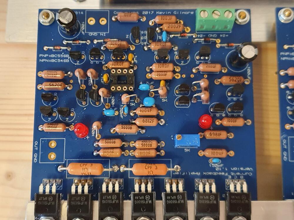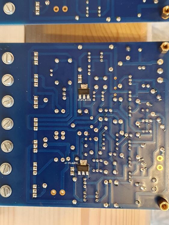 So I wired the amplifier board to the GRLV. One channel fires up ok. Both leds giving light, about 150mV across the output resistors 90mA offset without servo and input open. On the other channel I have one of the LED not lighting. No reading on output offset. all the LEDs test ok with a multimeter I diode check and emit a small light. On the mjf15030, the output resistor reads 30mv across. On the 15031 nothing across the output resistor. I don't see any solder bridges. Should I start replacing stuff? -