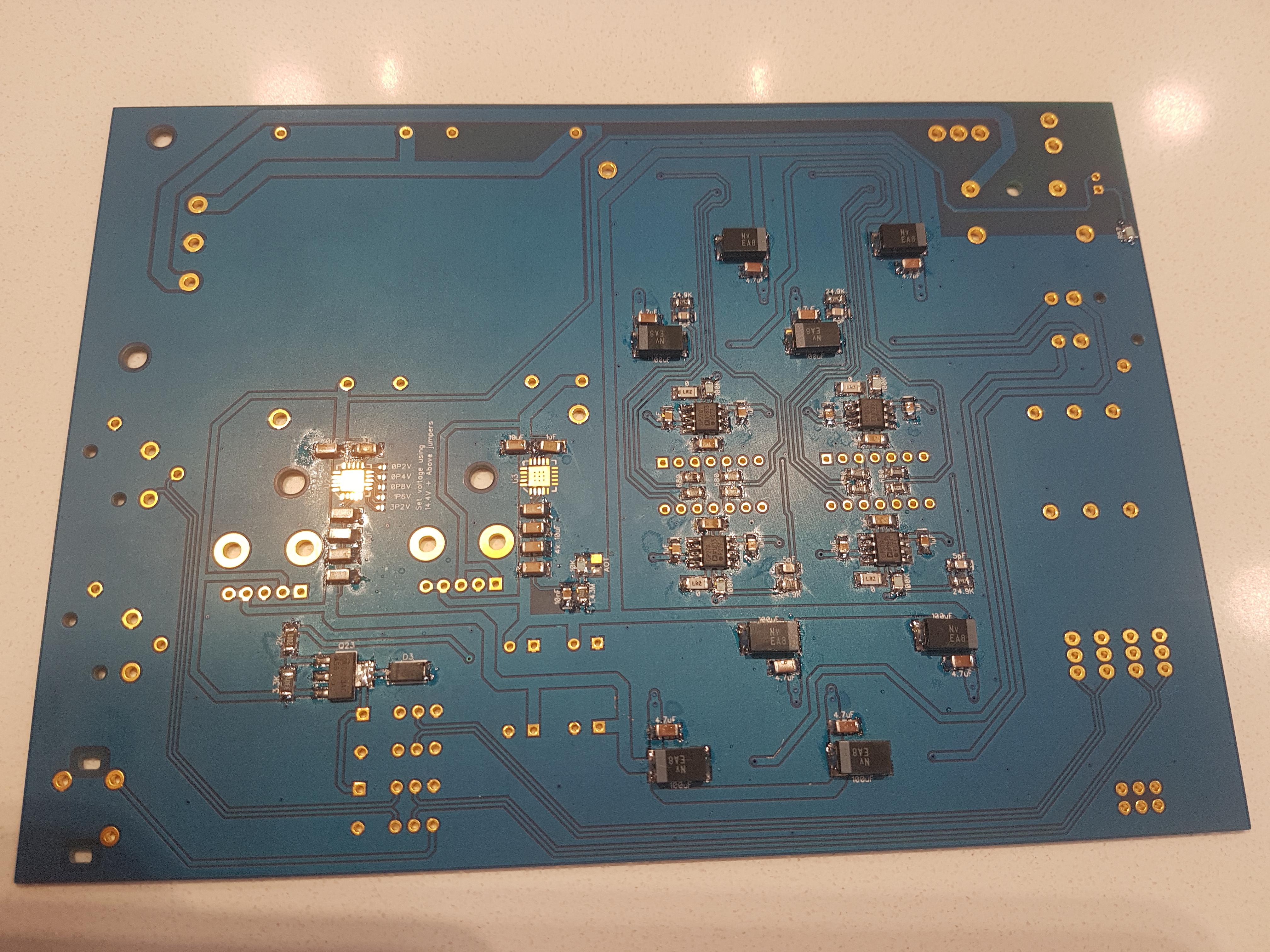 Underside of the dynalo mini done, just need to clean the flux residue when it's all done. Those 0805 resistors are starting to be the smaller I can solder without magnifying glasses. I just noticed looking at the picture that the tantalum capacitors don't have the positive to the same side of the board. I must hsve confused this somehow and will take care of it in the morning.