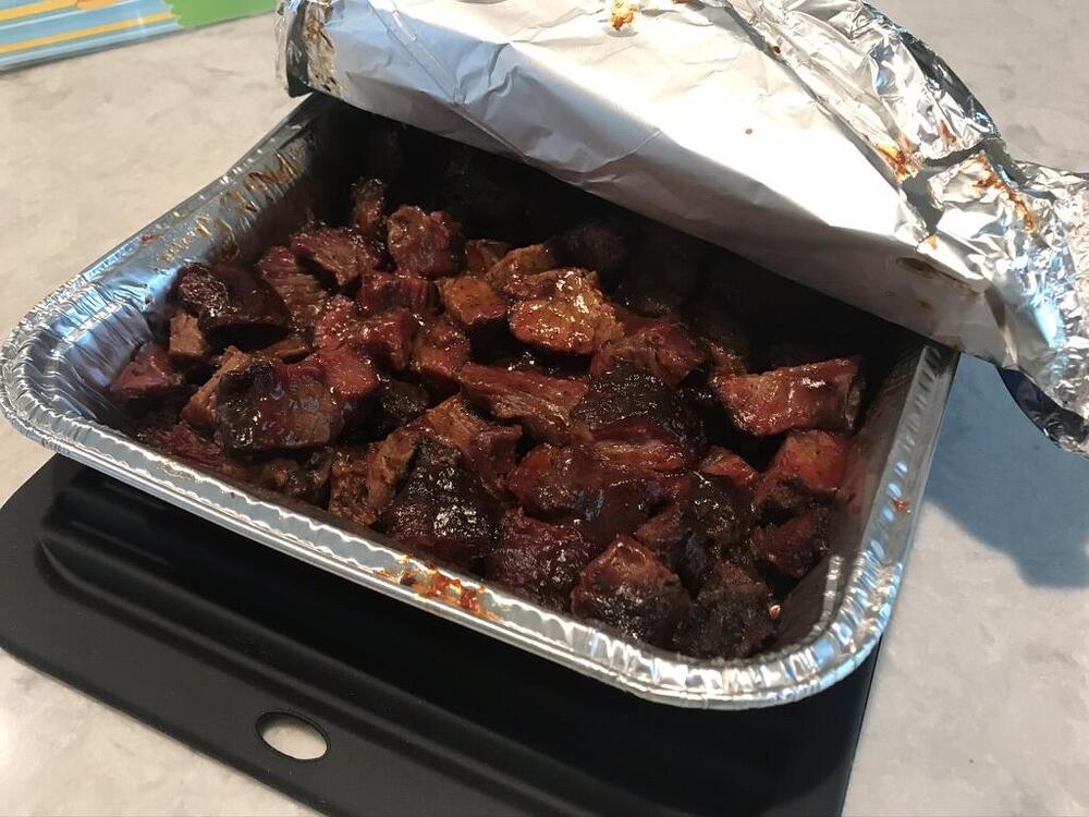 Trying the next brisket experiment on the Traeger. It's a 4lb (trimmed) point so we'll see how this turns out compared to the flat that I did previously. It was a bit of a bizarre cut, I think that they actually cut the whole point off of the flat so the right hand side (as shown above) is pretty floppy and unsupported. I'll likely end up turning half of this or so into burnt ends to go along with some traditional brisket slices tonight for dinner.