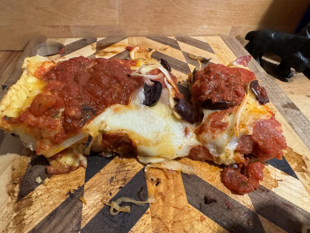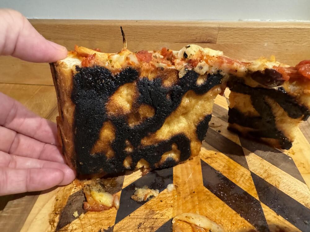 It was damn hot here again so using the oven seemed crazy. So I cooked a Detroit pizza on the weber tonight for Claire's book club. I started it with the pan right over the active hot elements and then moved it to the other half of the grill where the elements were off. Kept the temp at 500-550 with the lid down. The bottom charred and I was worried at first but it was not too much and tasted good, not burnt. I failed to take a pic of the whole thing but here is the last piece and a half from top and bottom.