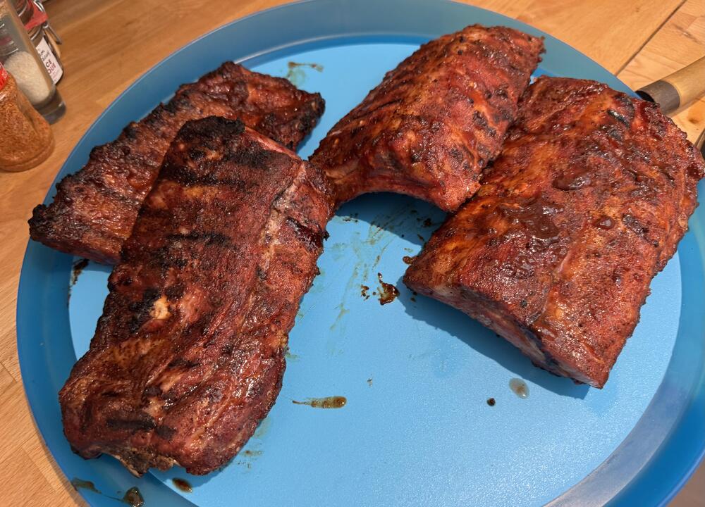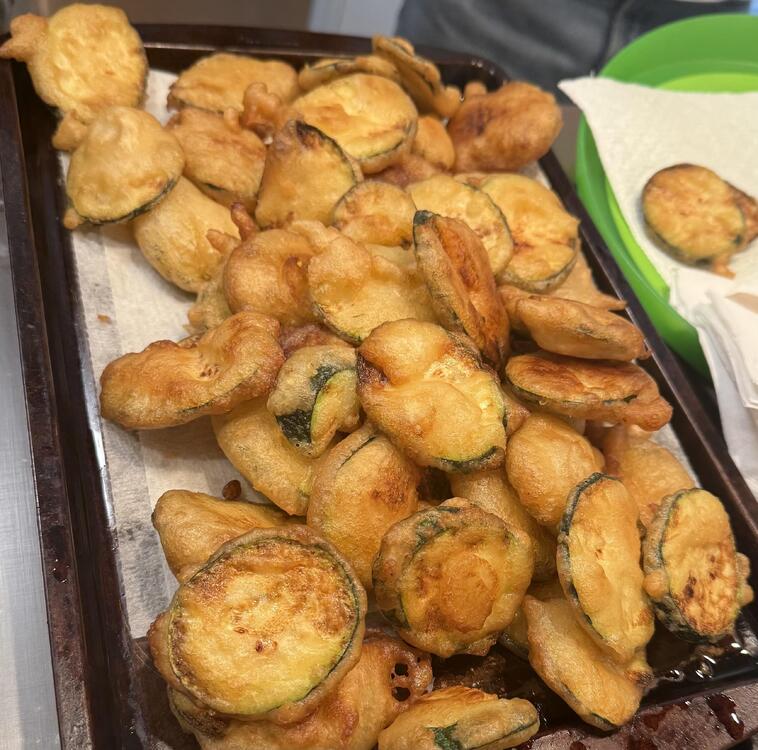 Memorial Day BBQ with Claire's sibs and families. My offerings were tempura batter fried zucchinis with an amazing tonnato dipping sauce from Pasta Supply Co. and a couple racks of smoked and grilled baby back ribs. Forgot to take a pic after cutting them up.
