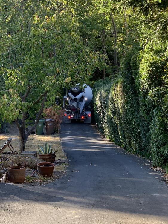 Further along in converting the garage to a proper shop, they poured the concrete for the foundation wall today. I had to leave a mark while it was still wet...