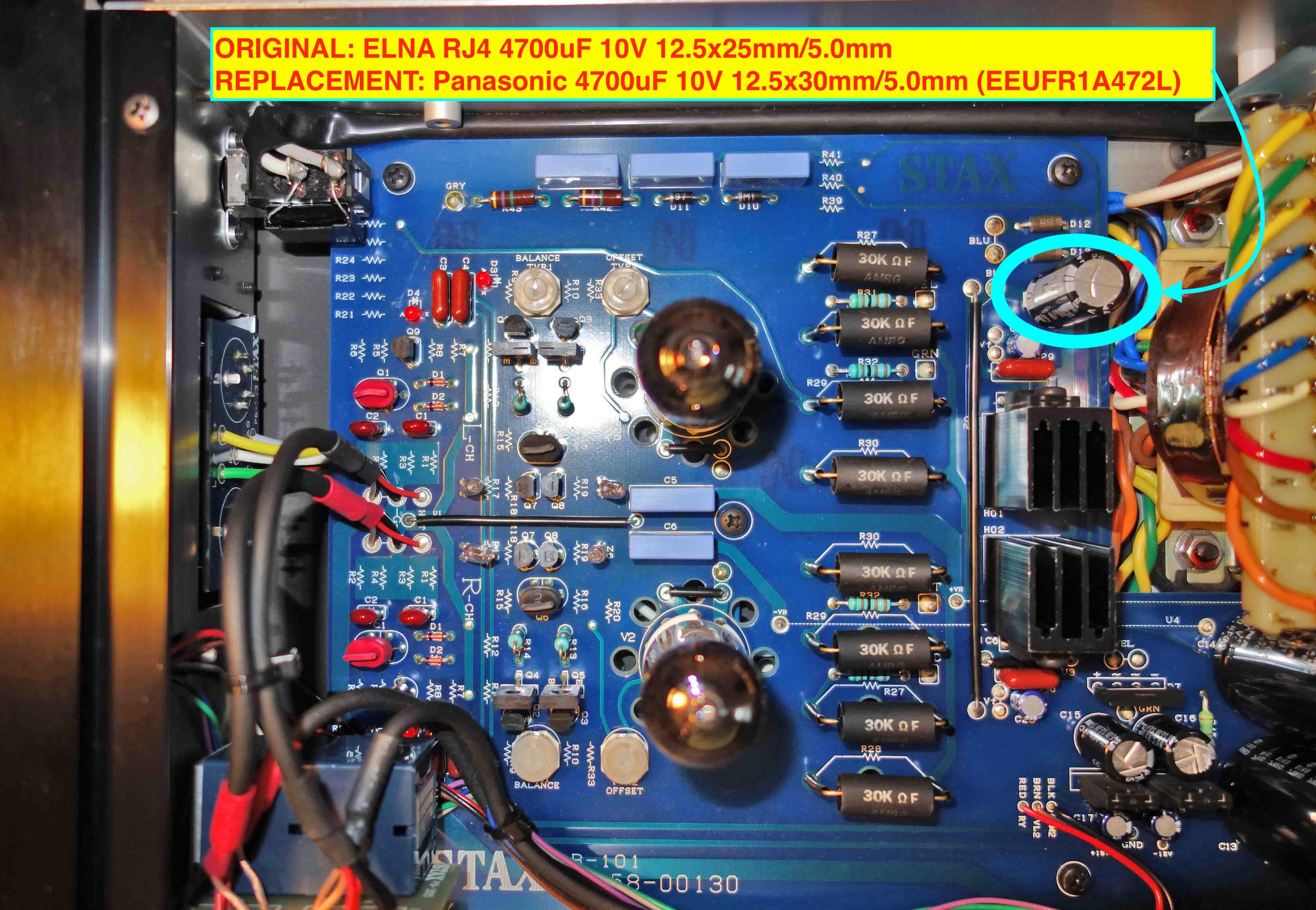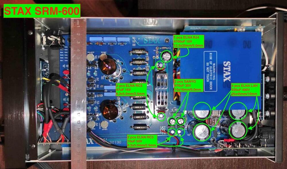 Folks, I replaced all the electrolytic capacitors in my SRM-600. I can't say for sure if this has happened before, but this (photo) capacitor at 10V 4700uF is heating up. Not very much, around 55C. The headphones aren't plugged in. Can you tell me if this capacitor is in normal operation? Does it have to warm up? My SRM-600 for 230V voltage. First, I supplied a cheap Jamicon TKR472M1AJ26 capacitor. It was heating up.Then I decided to place EEUFR1A472L Panasonic Low ESR capacitor. However, it's warming up, too. I checked the diodes next to it - they're not broke. On the cap about 7V. Any other caps running cold. Only 4700uF/10V running warm. I double-checked all capacitors parameters and they match (or exceed) the original: Original: ELNA LAH400V221MS36 220uF 400V 25х45mm/10mm <--- Rated ripple current (RRC Arms) = 0.87 Replacement: TDK/EPCOS B43642B9227M0 220uF 400V 25x35mm/10mm <--- RRC = 1.03 & ESR at 100 Hz = 460 & Impedance = 680 Original: ELNA RJ4 4700uF 10V 12.5x25mm/5.0mm <--- RRC = 1250 & ESR = 0.11 Replacement: Panasonic EEUFR1A472L 4700uF 10V 12.5x30mm/5.0mm <--- RRC = 3630 & Impedance = 0.013 Original: SANYO 35ME470HC 470uF 35V 10х16mm/5.0mm (S.E.8N Black 85°C Standard series) <--- RRC = 585 Replacement: TDK/EPCOS B41888C7477M000 470uF 35V 10х20mm/5.0mm (B41888C7477M000) <--- RRC = 1500 & ESR at 10 kHz = 0.050 & Impedance = 0.046 Original: ELNA RC3-16V470MF0 47uF 16V 85°C 6.3x5.0mm/2.5mm (RC3 F0 Blue 85°C) <--- RRC at 85°C = 70 Replacement: HITANO E5R 47uF 25V 105°C 6.3x5.0mm/2.5mm <--- RRC at 105°C = 60 Original: ELNA RC3-50V100MF0 10uF 50V 85°C 6.3x5.0mm/2.5mm (RC3 F0 Blue 85°C) <--- RRC at 85°C = 40 Replacement: ELZET CD50H 22uF 50V 105°C 6.3x5.0mm/2.5mm <--- RRC at 105°C = 40 Before the replacement, I did not check if the 4700uF/10V had been warmed. This could be his normal operating condition. It is simply not clear to me which components of the circuit can affect it: from the transformer comes two BLU-wires at 6.3V AC current, then there are two diodes in parallel converting to DC current, and then there is a 4700uF/10V capacitor, which receives these 6.3VDC. There is simply nothing to break. Any suggestion?