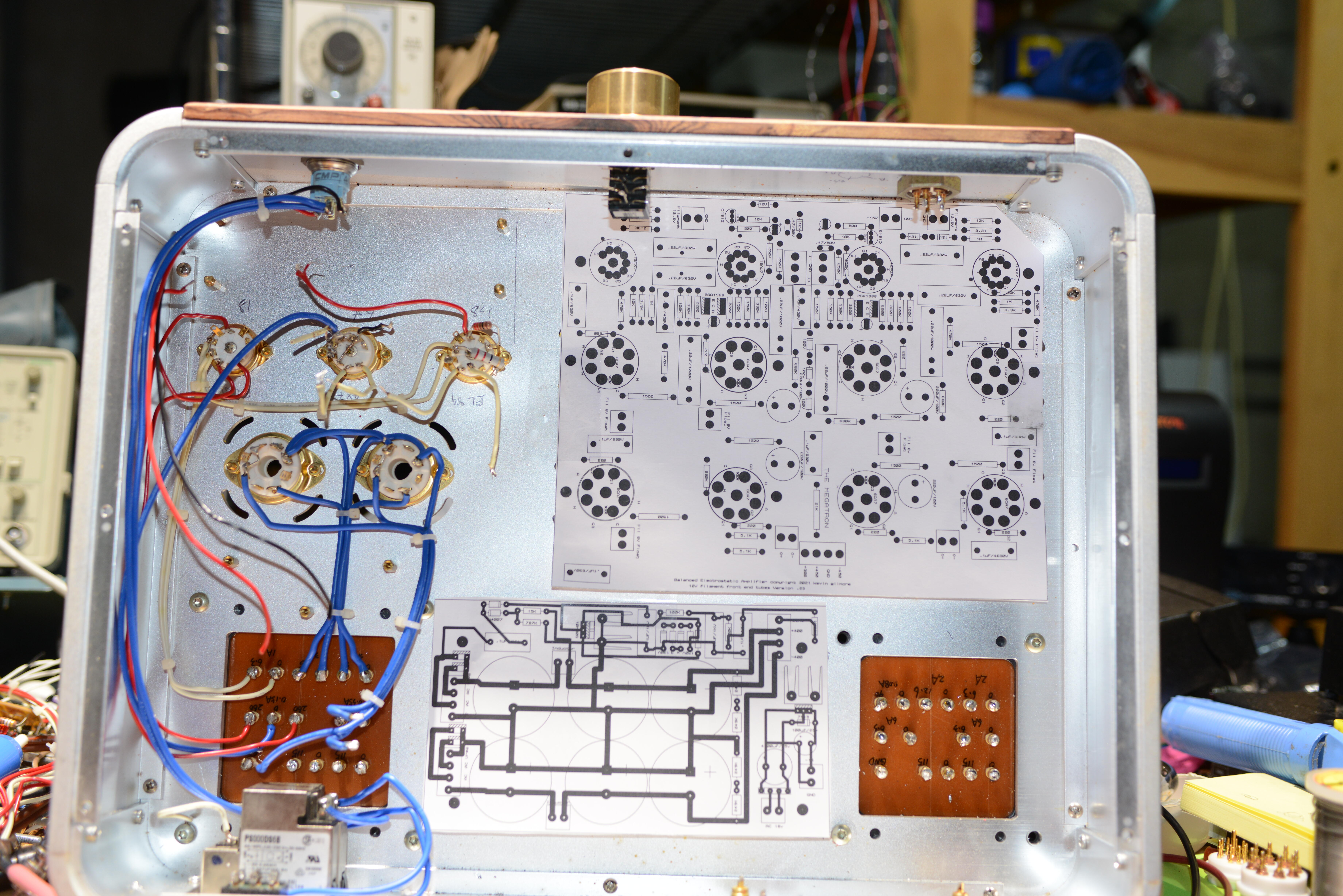 the biggest problem is that the tube sockets are up to .02 inch off in both x and y. really hard to make a circuit board with tube sockets fit into the holes with a top panel that is .35 inch thick. and all the blind holes for the other board mountings were hand tapped and then the holes in the boards were made bigger till it fit. this is so hopelessly fucked. might have to make the holes in the tube sockets much bigger to allow for the slop. No room for a regulated power supply.