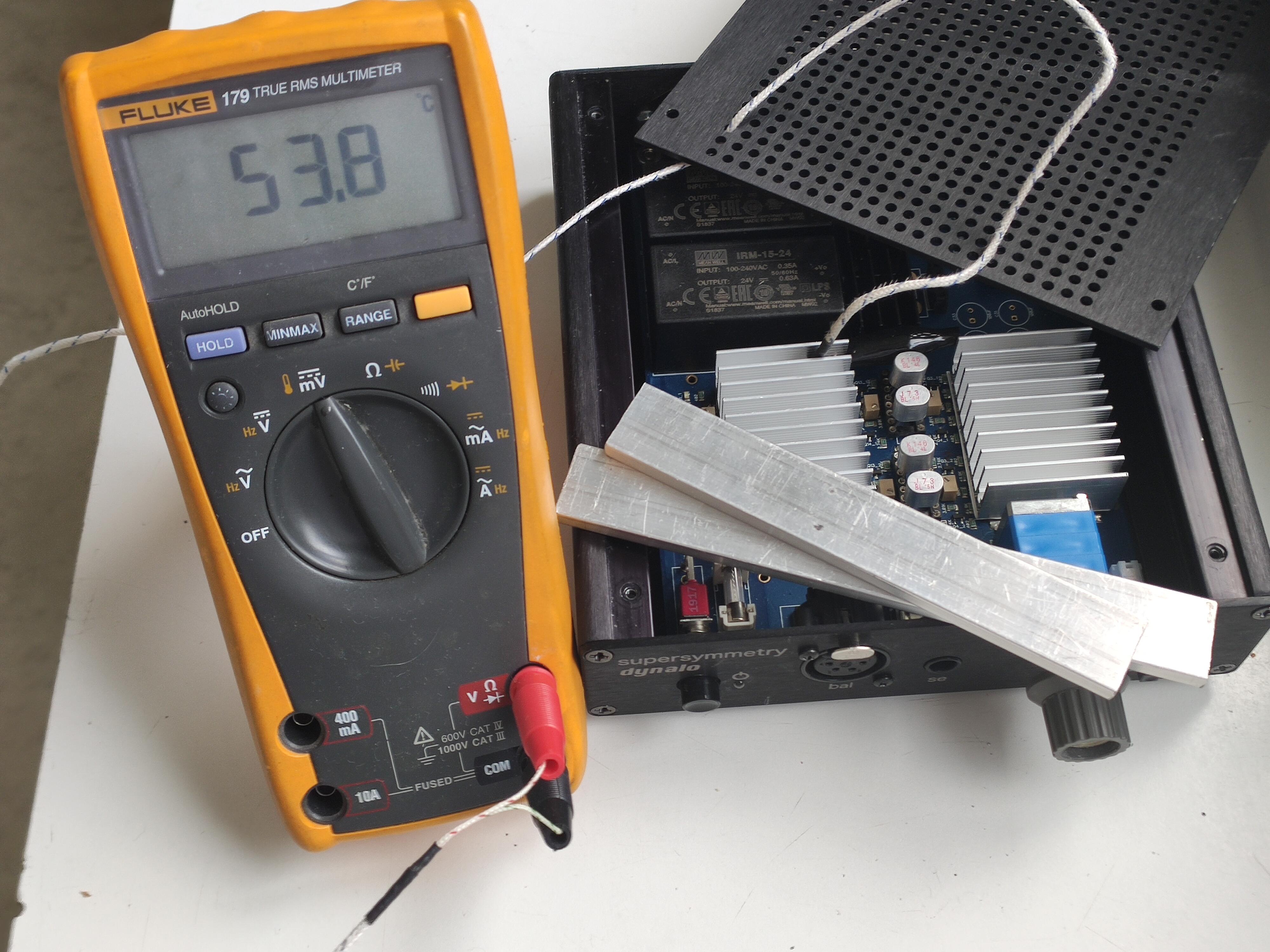 judo Posted April 14, 2020 Report Posted April 14, 2020 (edited) To the heat issue: I have a "standard" mini from the first group buys. Case, the unfortunate 3 oz board, 402 led resistor, 255 bias resistor, 15 mA bias. I used it with offboard regulators and without the top cover mainly for a time. Now I squeezed in the onboard regs second times a bit better with the same heatsinks but only with open lid. I would not like to reduce the bias so I experimented with @Skooby's resolution(see in this thread) a little. In my version there is almost 10 mm the distance from the transistors's heatsinks to the lid so I made a "heat bridge" from two 5 mm thick aluminium pieces as you see in the picture. The result is more than I hoped. Measuring the temp on the heatsink hotter side: with the top cover 85-86C; without the cover 70C. With the "heat bridge" and the cover 63C. The absolute temperature is depends on the ambient, the music, the headphones a bit but the more than 20C gain is stable. This was a surprise to me, the mod is easy maybe helps somebody. You can secure it with screws, widen it etc.. Maybe later. It is stabil mechanically I am happy with it as is. Thanks for Skooby! The temperatures were measured after cc. 90-120 minutes when they were stable. Edited April 14, 2020 by judo a remark 1