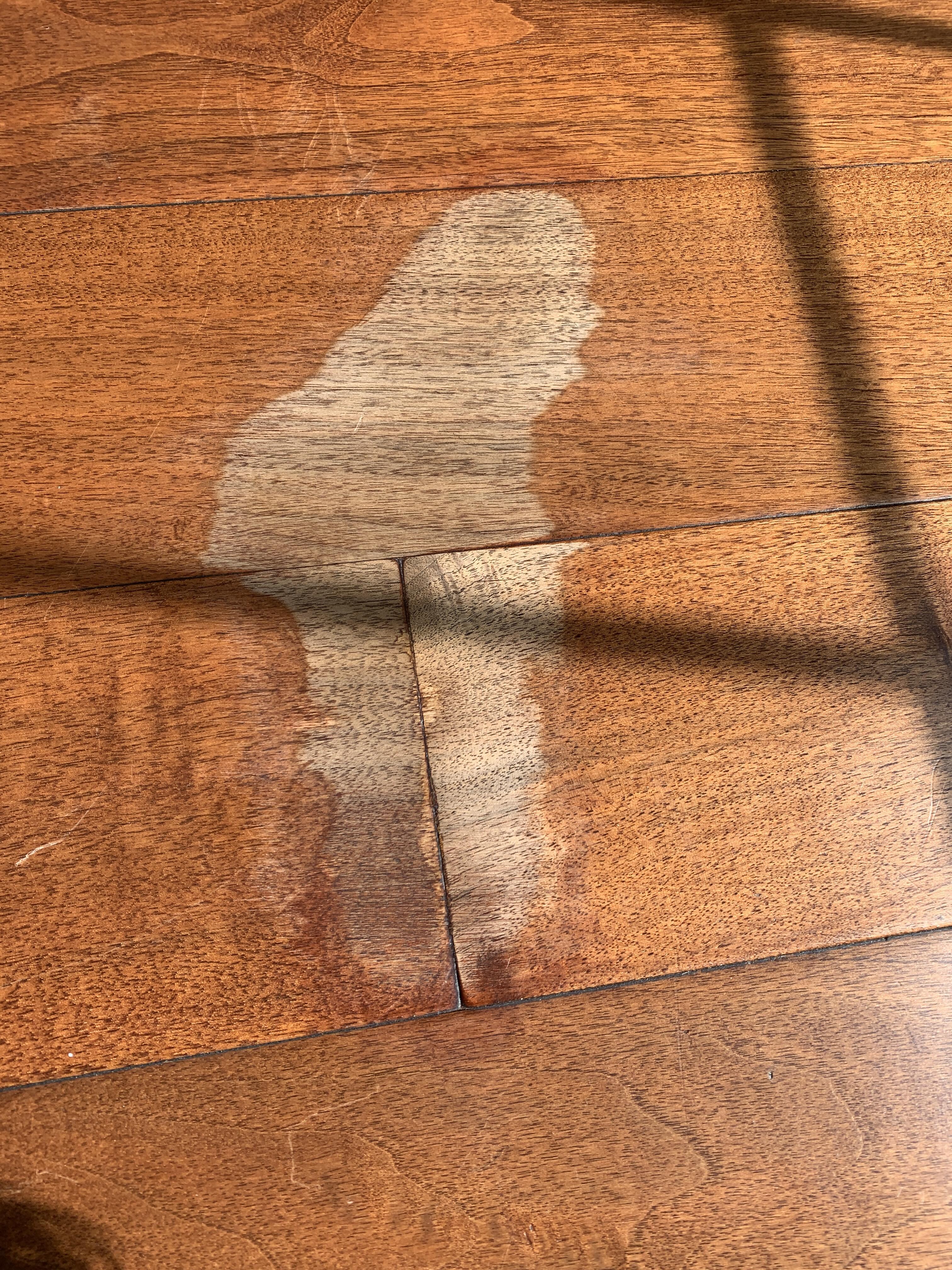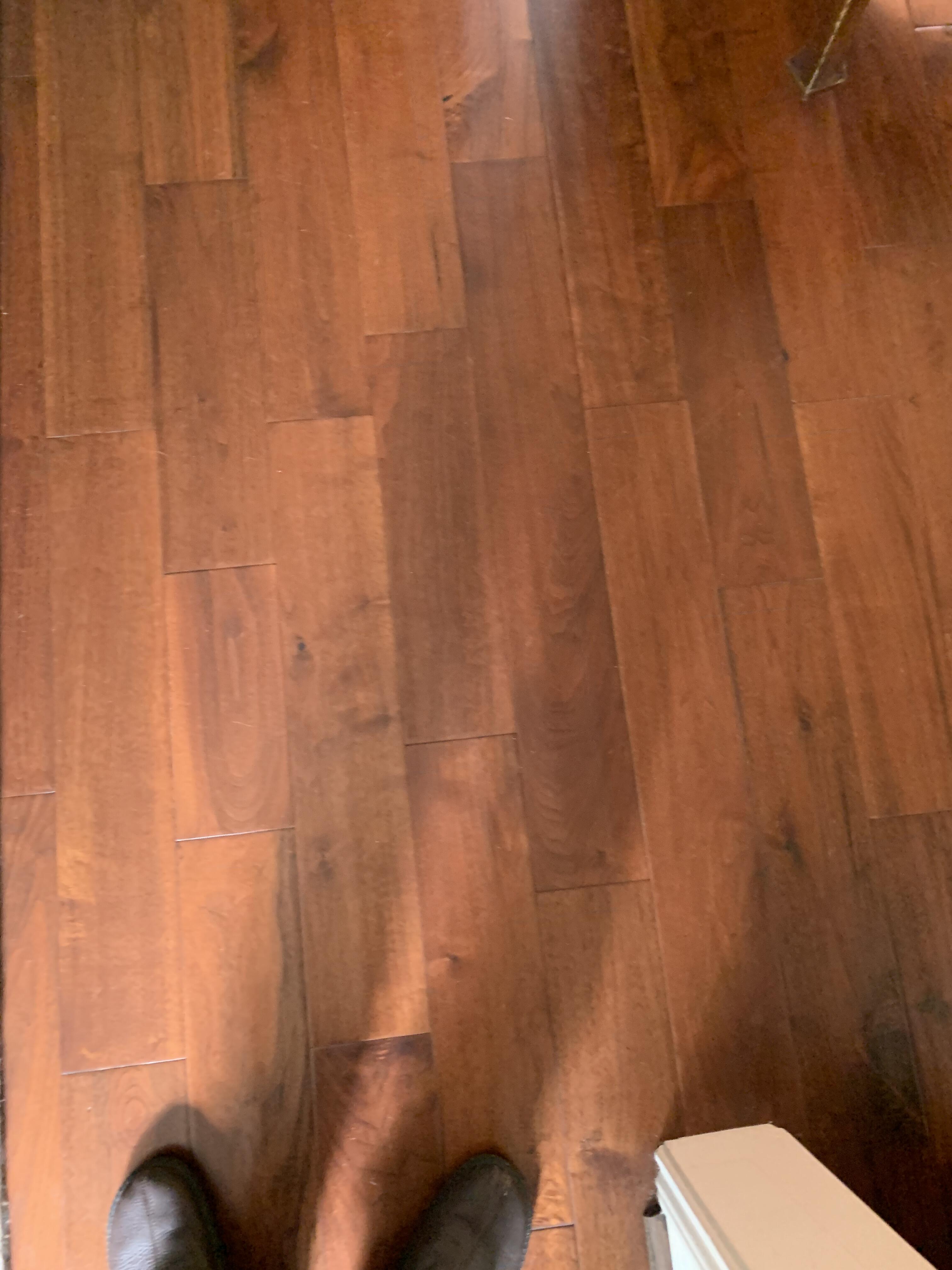 We brought in some "experts" a friend recommended and they made it worse...pooch scratched it up and then they go to sanding it only to realize that the stain they used was absorbed far too easily to match the finish on the Brazilian hard wood.  Other "experts" wouldn't touch it.  Clearly there's some more complex stain and finish than they wanted to mess with or the size of the job so we were left with this....