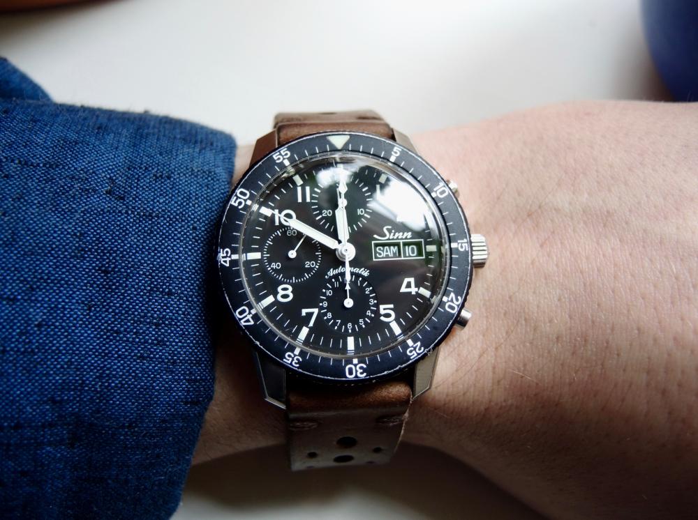 That is a good looking chronograph and I like how you paired it with the brown strap.  Sinn does not appear to offer that vintage style strap with the holes currently although it may be as simple as a request of them.