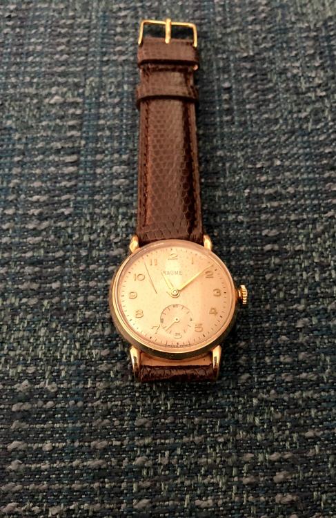 Hopstretch Posted September 12, 2018 Report Posted September 12, 2018 Ha! I forgot to post this before, too, a curiosity. My great-grandfather's Baume Brothers watch. Plated, nothing special, well before the union with Mercier in 1918 -- I would guess late 19th Century based on his age and life story. Went to my grandfather, who reputedly wore it daily, then my Dad, who left it in a drawer since the '60s. Dial is in rough shape as you see, but I had the movement repaired and put a new strap on. It runs OK and my wife now wears it occasionally, for it is teeny tiny by modern standards, maybe 31 - 32 mm. I like having it anyway, feels like a (literal) time capsule from the ancestors! 4