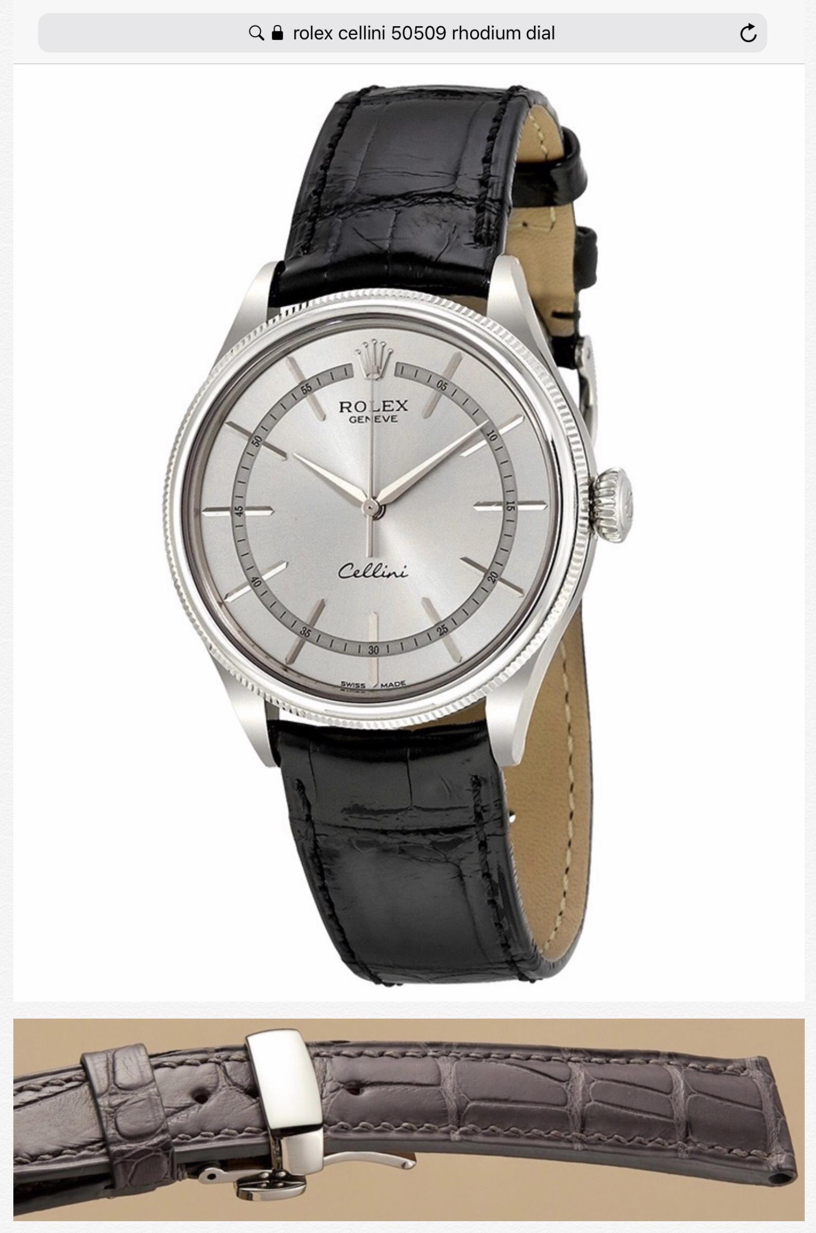 Dave R Posted June 16, 2019 Report Posted June 16, 2019 10 minutes ago, EdipisReks1 said: I'm looking forward to seeing the strap on the OP. They look to be well made straps from where I’m getting it Reks, so looking forward to having the one ordered fitted, change of plan though. I’ve been told thin spring bars will be needed to keep those end links I got on, and I’ve decided I’d like the Rolex OP spring bars used, which means those end link may have to come off. The reason I’m wanting the OP spring bars used, is because they look to be the same size as those on a Cellini, and after seeing photos of a Rolex Cellini 50509 with Rhodium dial and loving its looks, I’ll be selling my OP for a Cellini with Rhodium dial. I’ll be getting one from a Rolex dealer in Leeds ( a city 11 miles from where I live ) but they won’t have one in for several months, which gives me time to save. One of the good things about a Cellini is its lug width is the same as the OP, 20mm, so that custom alligator strap can be used. Anyway to be honest, like said by others here which I agree, the Oyster Perpetual looks best with a bracelet, and the only reason I’m using a strap is I find them much more comfortable. Some photos of that Cellini with Rhodium dial. The photo above is the Cellini with a back strap and the dark grey one I’m getting, I’ve put them together for comparison, and to me the dark grey strap should look nice but more importantly is a different colour to that on my Saxonia, so I won’t have two watches looking similar. ?