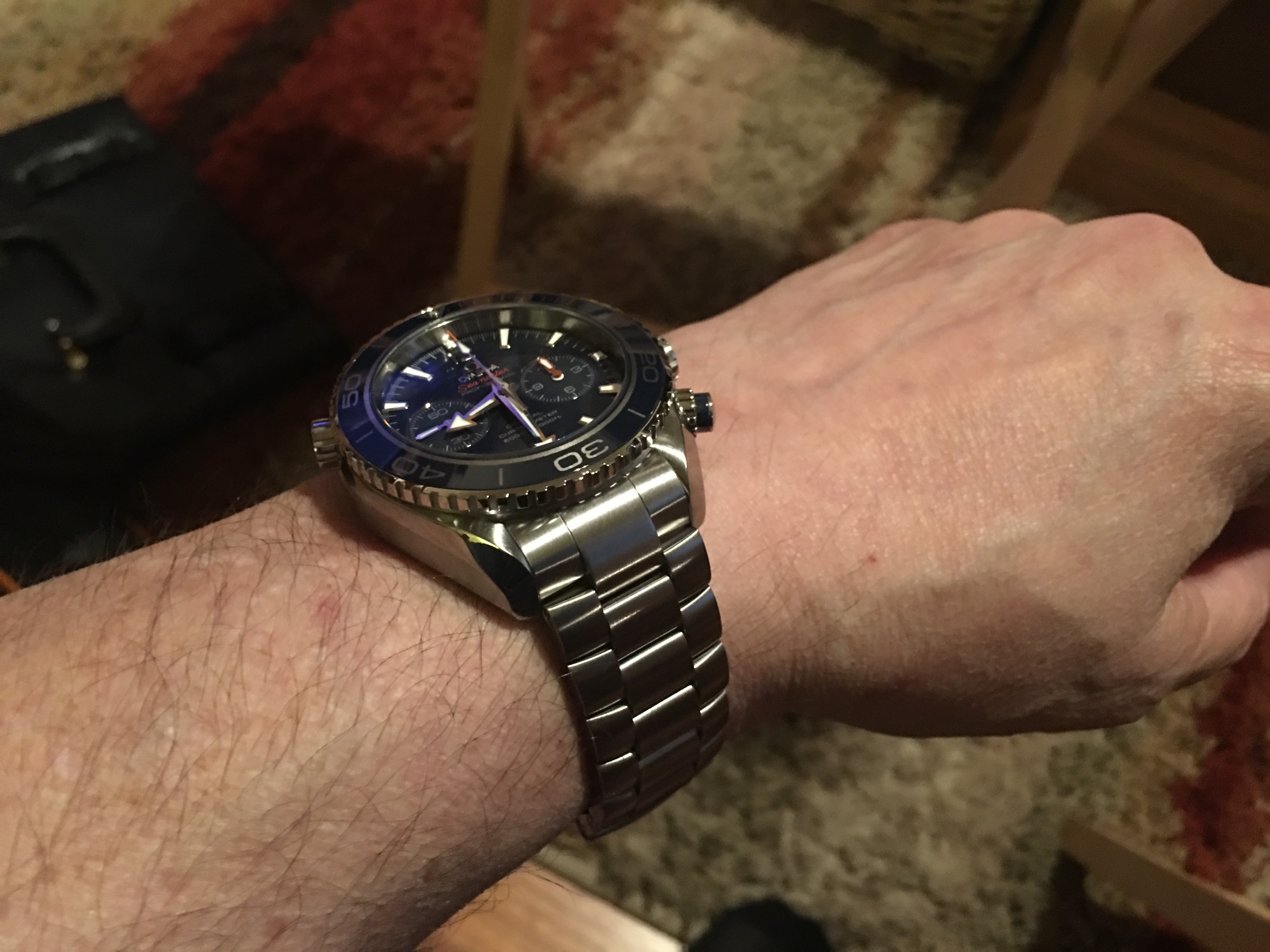 HeadphoneAddict Posted March 23, 2016 Report Posted March 23, 2016 (edited) 23 hours ago, Dreadhead said: Enjoy Larry. I didn't know you were looking at the spring drive diver. Yeah, I was considering the Ti Spring Drive Diver, but instead I fell in love with the SBGX115 9F61 HAQ diver because of the gorgeous white dial, and then added this Omega Titanium PO 9300 chronograph. The GS white dial is every bit as nice as those on my Polar Explorer II watches. Just amazing build quality. This Ti chronograph a fairly large watch, but it fits my body type well (see photo taken from farther away rather than 12 inches from the camera). I'm down from 245 to 212 pounds, but I'm still not a tiny guy. I switched it out to the bracelet minus two links, and while the bracelet doesn't squeeze the sides of my wrist like the ISOFRANE, the watch feels heavier. I think that I'm going to order the Omega blue rubber white stich strap with Ti folding clasp. This is the watch that will likely prompt me to sell my 2 year old Seamaster Pro ceramic bezel diving chronograph sooner than later. Edited March 24, 2016 by HeadphoneAddict FIXED PIC #3 FOR WRONG WATCH !!