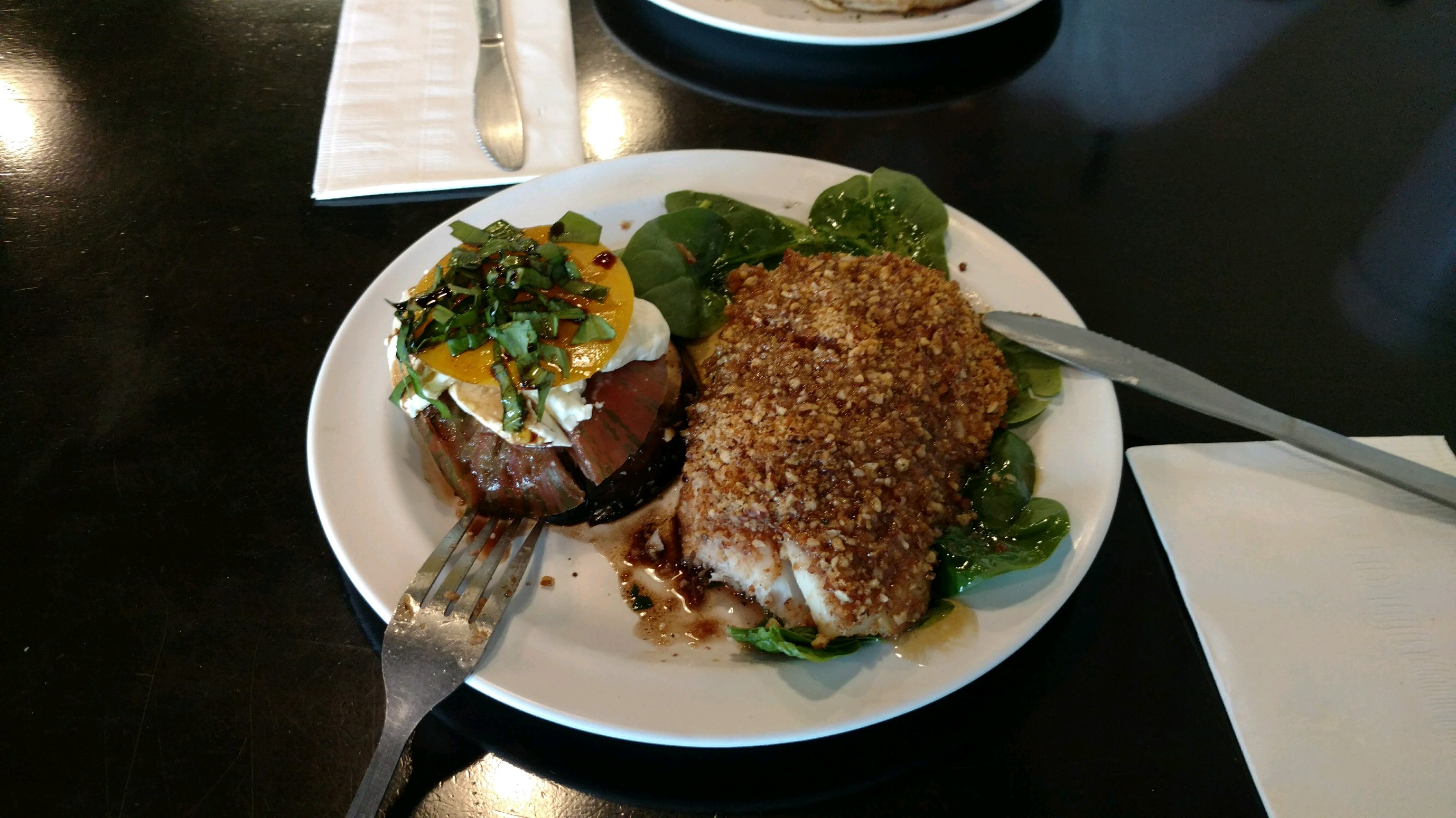 Lunch today... Pecan encrusted Red Snapper, heirloom tomatoes, eggplant, Buffalo mozzarella w/ balsamic vinaigrette. It was yummy!