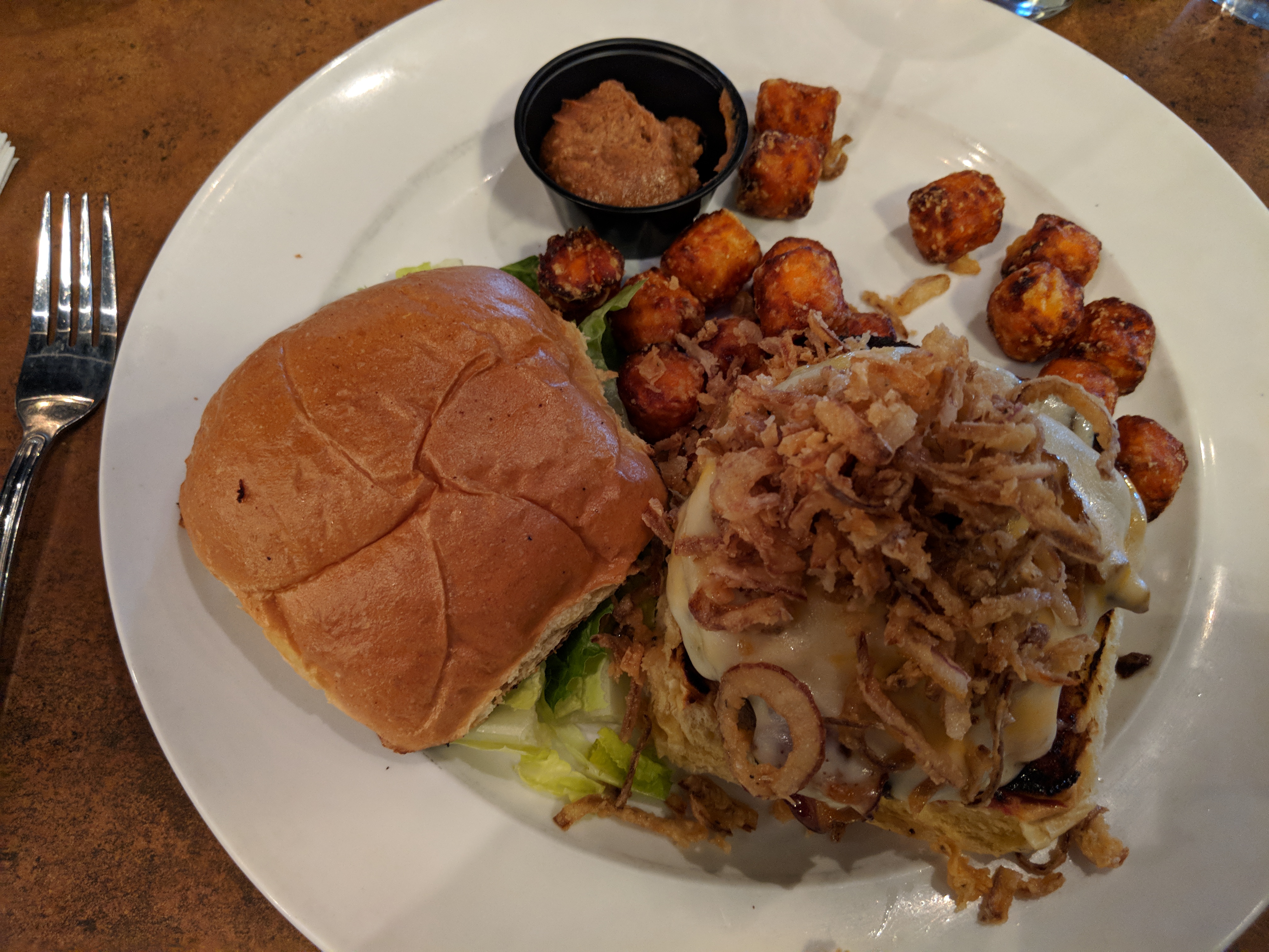 tkam Posted December 16, 2017 Report Posted December 16, 2017 Pretzel Sticks with beer cheese sauce Alabama slammer - brown sugar glaze, bacon, provolone, cheddar & onion straws plus a side of sweet potato tots with cinnamon butter This might be my new favorite burger Chocolate mousse cake 2