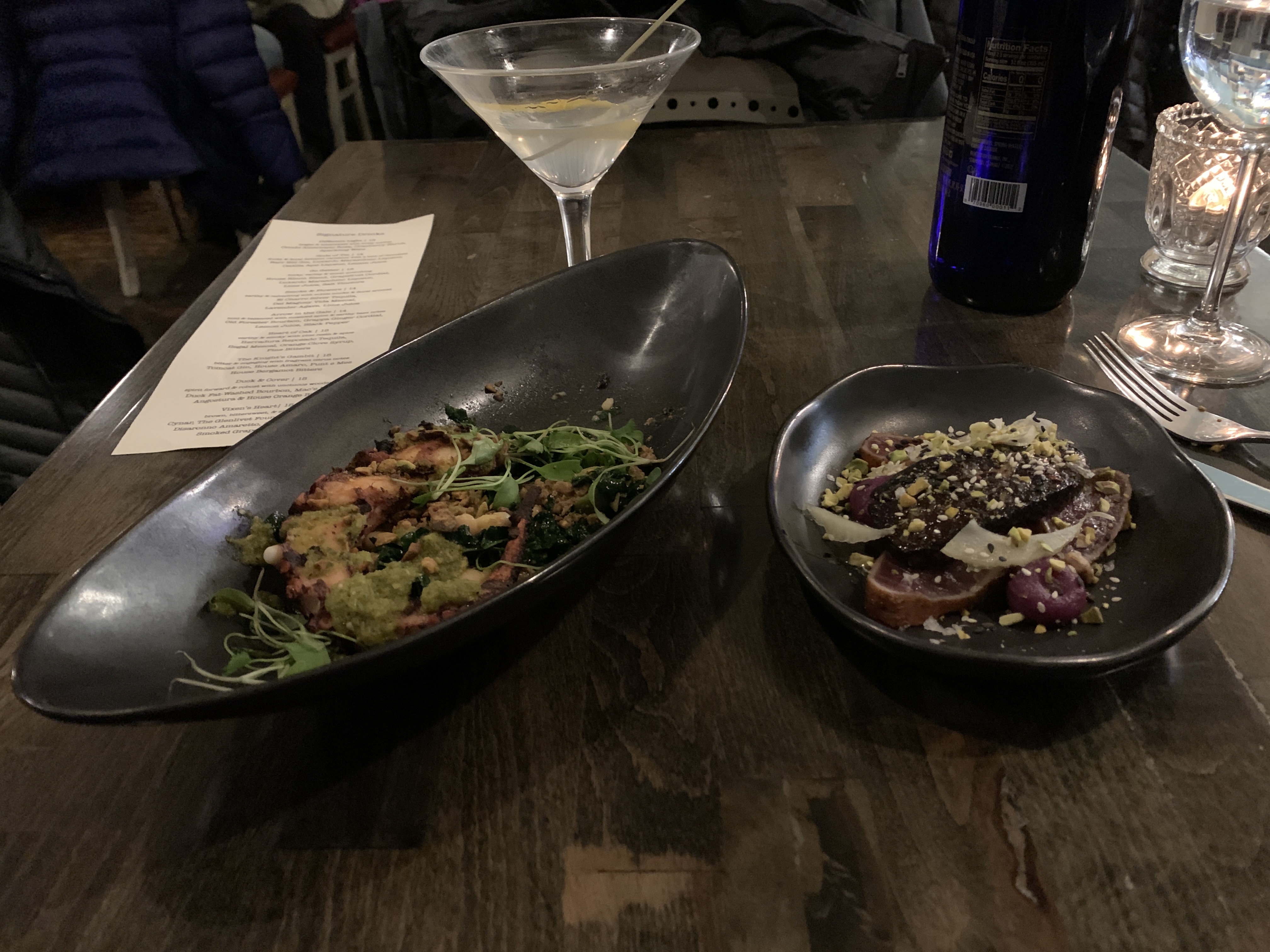 then a small plate of grilled octopus (left) and seared foie gras and ahi tuna (right)