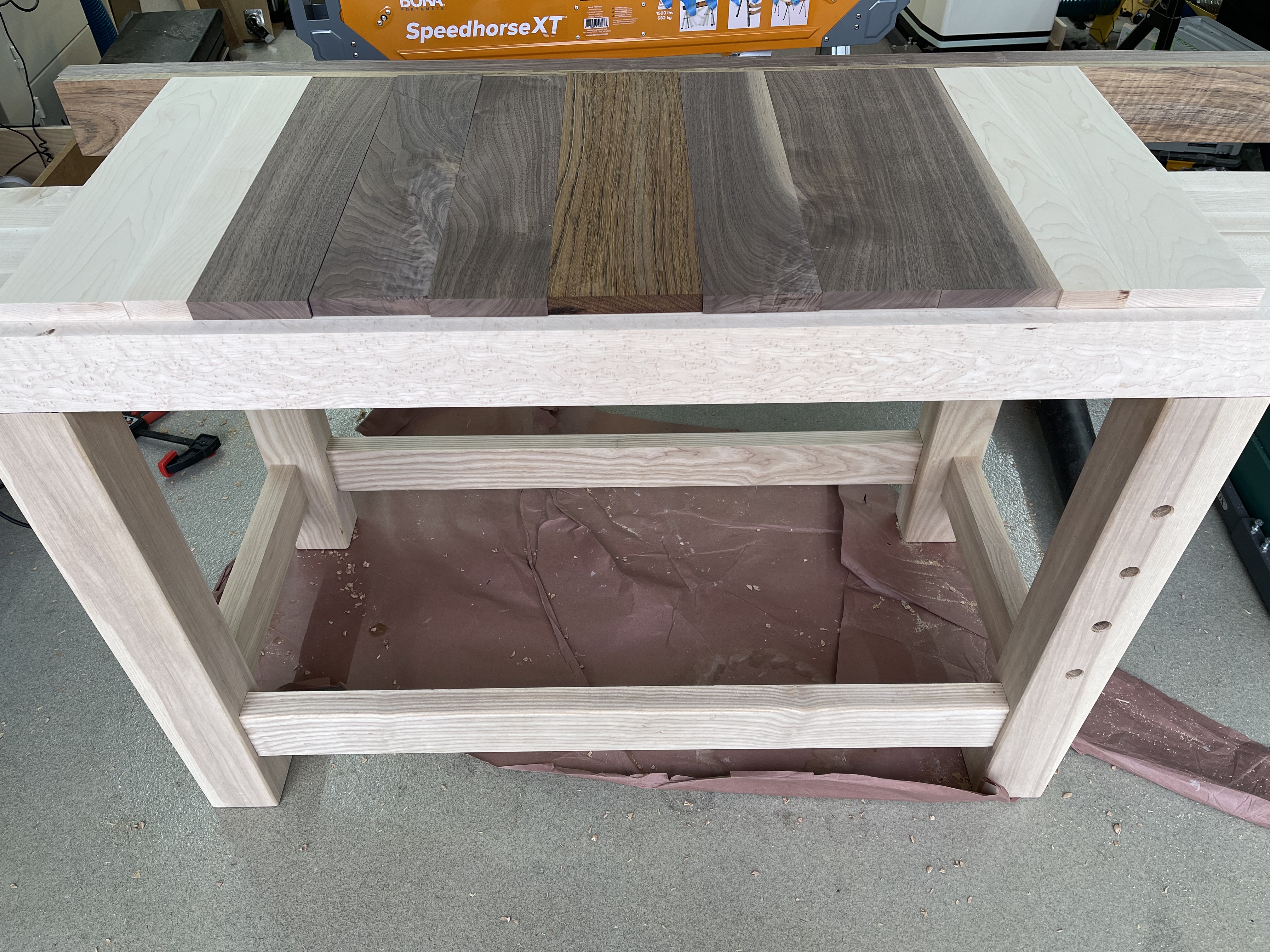 VPI Posted March 21, 2023 Report Posted March 21, 2023 Trying to decide if I go all walnut for the bottom ship lap shelf or incorporate the Jatoba, maple and walnut from the top. Also got the final glue-ups of the top done so now only one more time wrestling them through the planer. 2