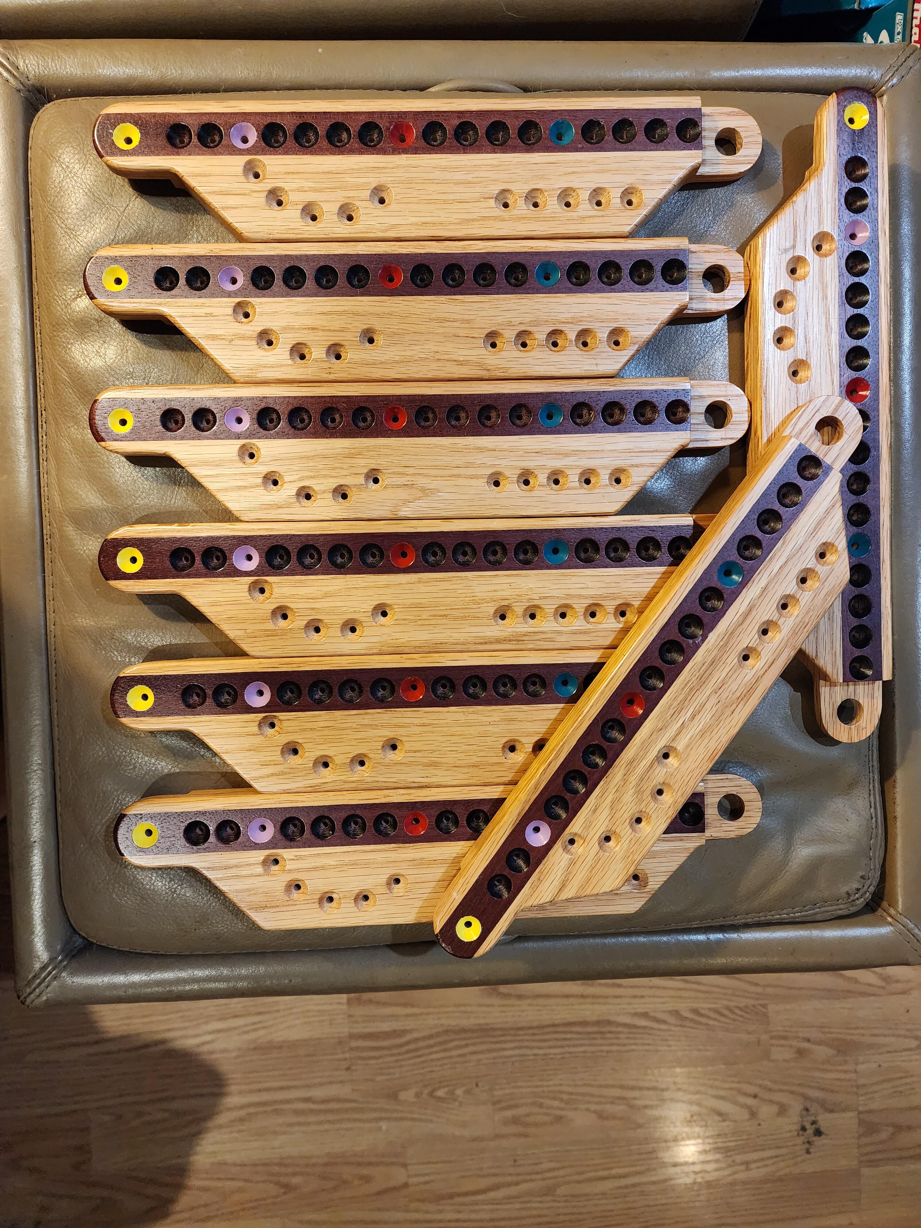 swt61 Posted November 29, 2023 Author Report Posted November 29, 2023 (edited) I visited my Mother for Thanksgiving and she's offloading. She gave me a decent Nikon digital camera that she gifted her Husband. But both of them are legally blind now, so photography is out, as well as game playing. My family has always enjoyed playing games together. In Texas my Mom, her Husband and I had several Winter Texan couples as friends. They all lived in motorhomes/fifth wheel trailers in RV parks. There was a game popularized in RV parks called Pegs and Jokers. It's kind of like Sorry, but played with cards on homemade game boards. I thought the original boards were quite fugly, so I designed my own version. The boards join together, so you can accommodate different sized groups. These are the original style boards, that are usually made by retired RVers. Anyway, she gave me the board set that I made for her, which is the first set I ever made. I've made dozens since then, but still like that set a lot. Edited November 29, 2023 by swt61 4