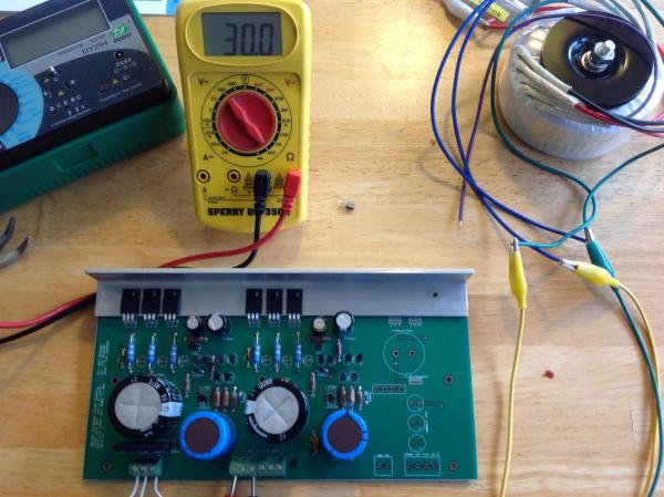 Ok, I've got power (one board assembled). The smoke did get out the 1st time though. Q22 (BC556B) died on power up and the Negative rail sat at ~-5V. Powerup was in the dual track config. I swapped to the untracked config and changed the transistor and it came up with some mystery smoke but otherwise ok. Then swapped back to tracking config and it still works. I looked all over the board and can't figure out where the mystery smoke came from.....but it did smell transistory.
